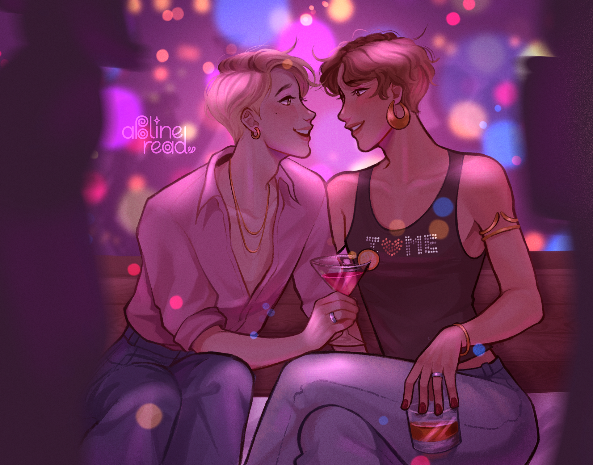 Original characters Tyler and Jesse raising a glass together to Pride 2024 on a magical night. Jesse (right) belongs to