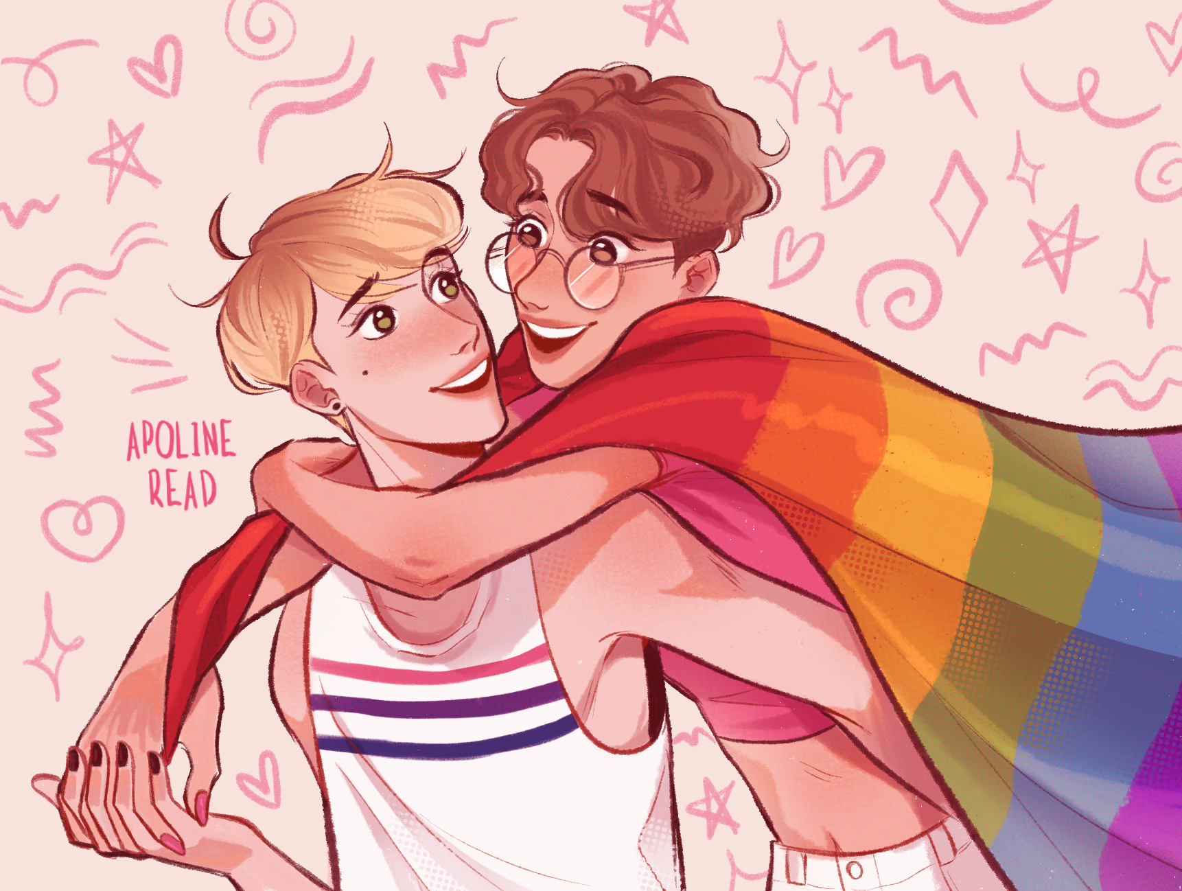 Illustration of Tyler and Jesse, original characters, in celebration of Pride Month. Jesse belongs to