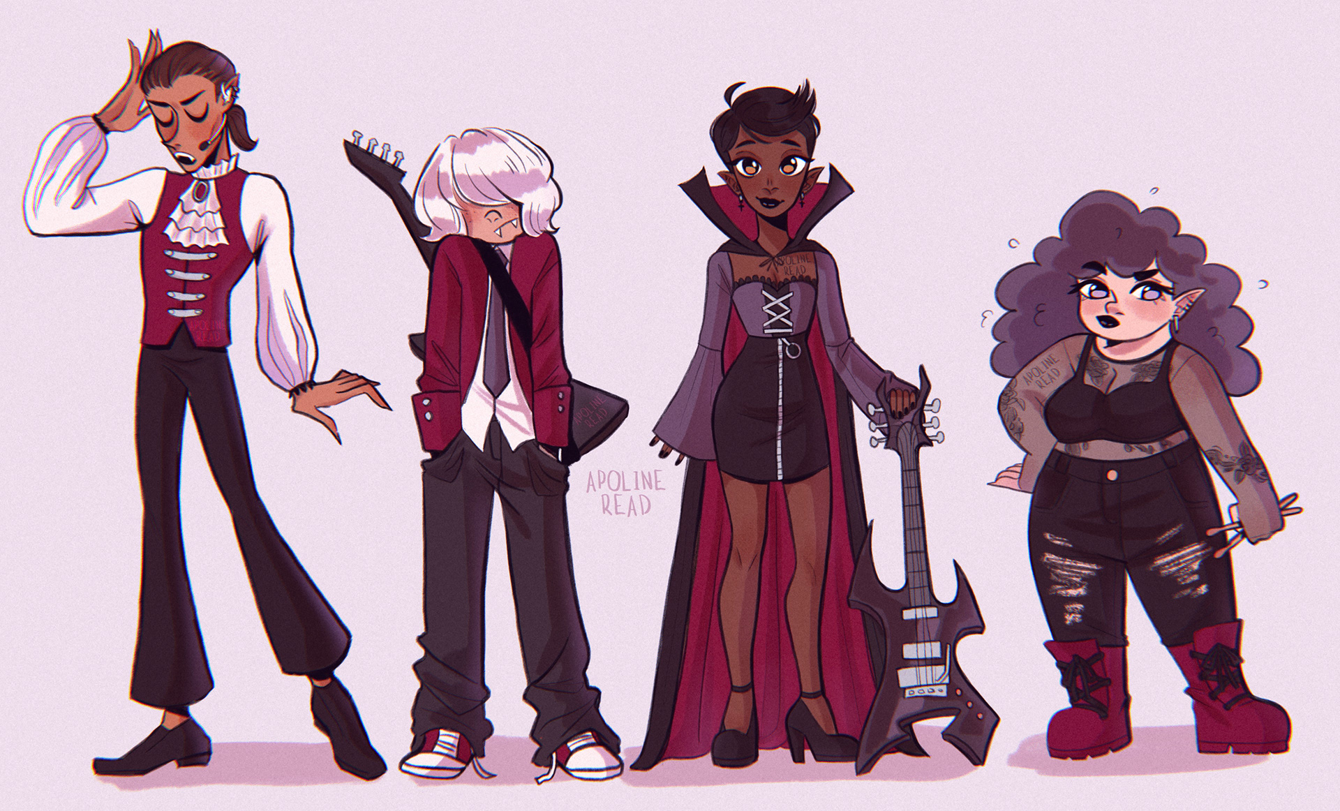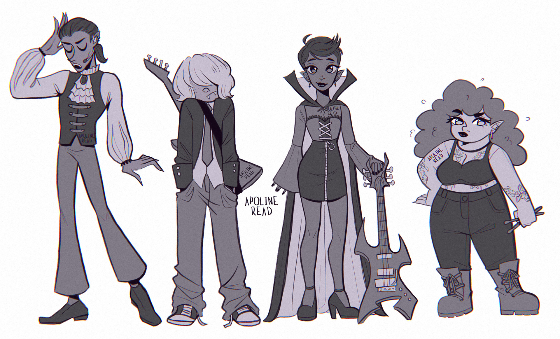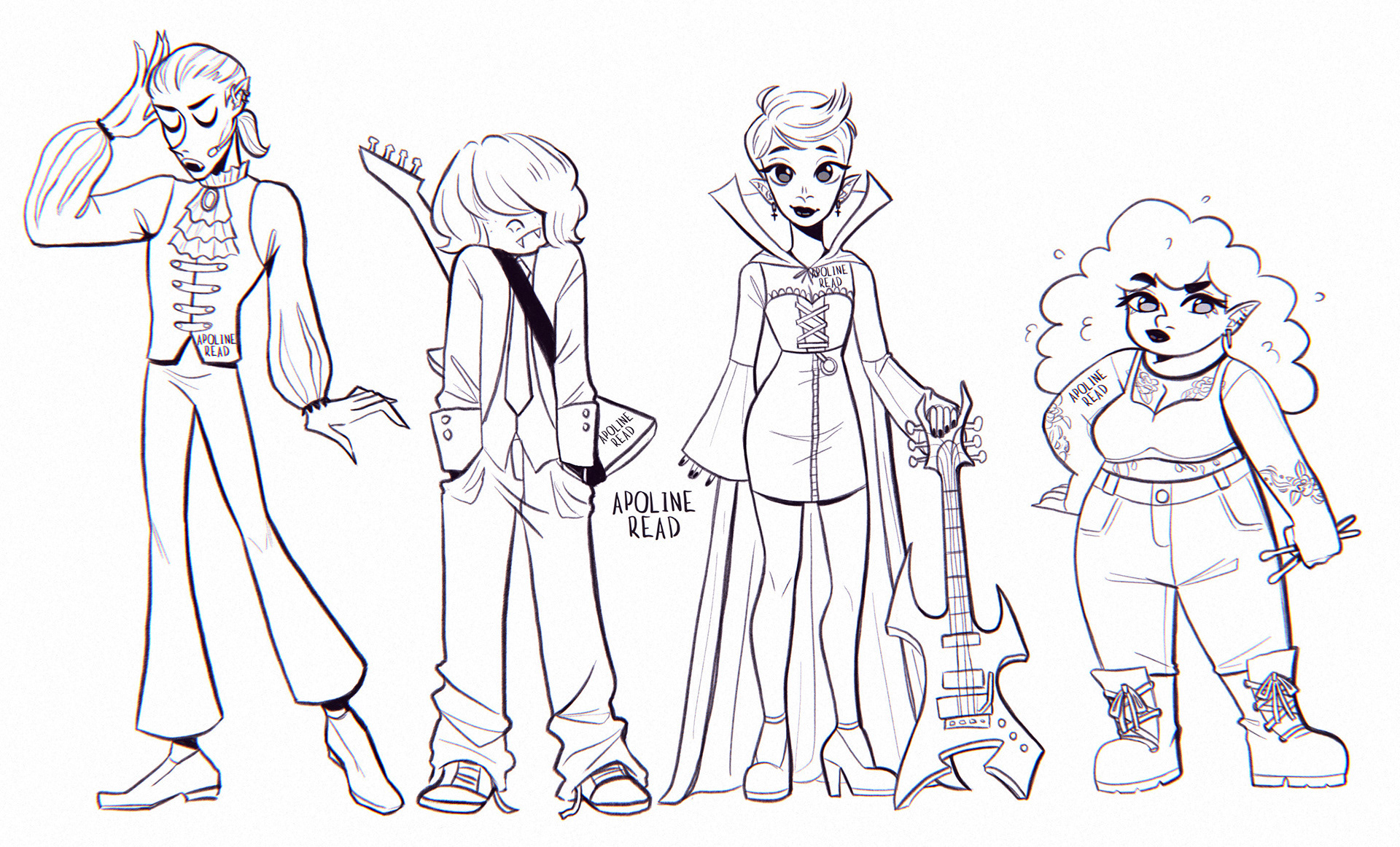 Character explorations based on the prompt "The 4 vampire musicians", taken from a guide in